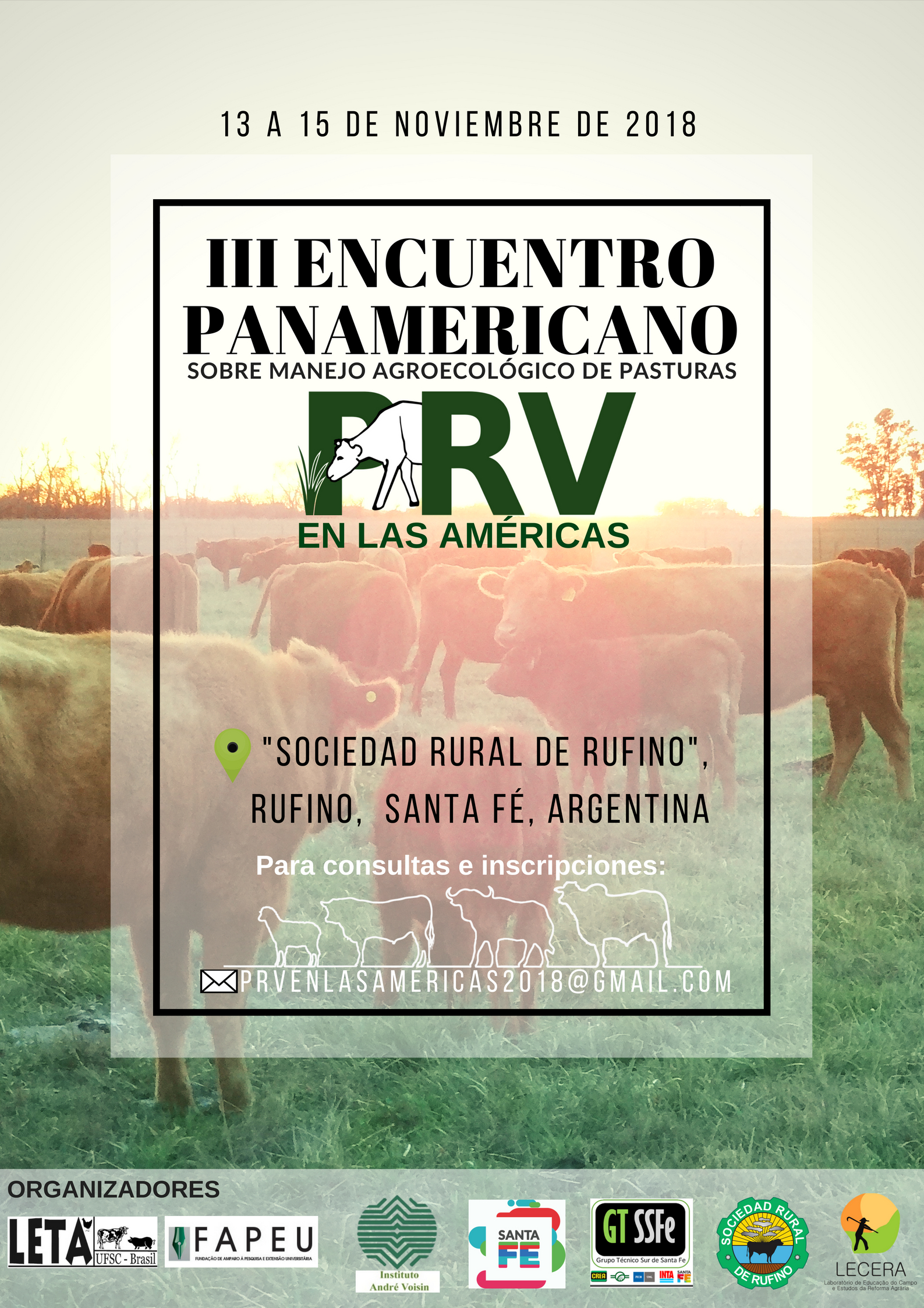 En el mes de noviembrese llevará a cabo el III Encuentro Panamericano sobre Manejo Agroecológico de Pasturas (PRV en las Américas), en la Sociedad Rural de Rufino, Provincia de Santa Fe. Tendrá una duración de tres días, desde el 13 al 15 de noviembre, siendo el último día una visita de campo al Proyecto “El Verdadero Paraíso”, con 25 años de PRV, ubicado en Amenábar, Provincia de Santa Fe.