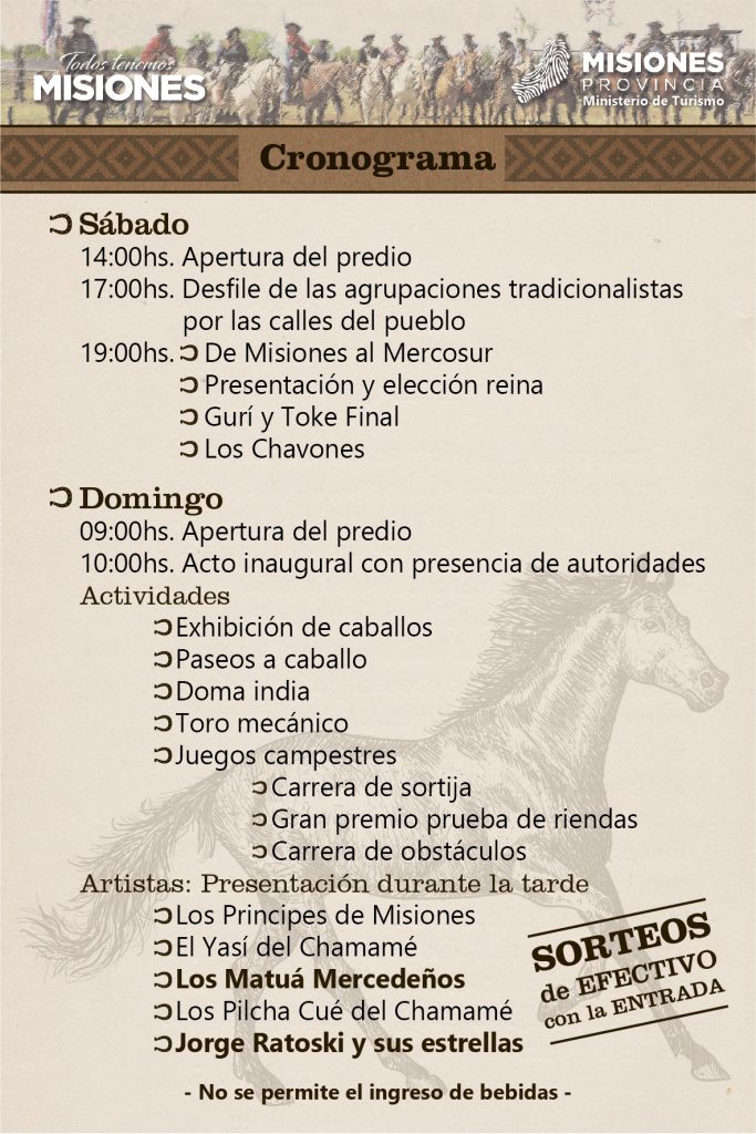 Por otra parte, el intendente Jorge “Kike” Tenaschuk resalta la organización en manos de la “Asociación Civil del Caballo y la Tradición” y todo los colaboradores del pueblo, además de destacar la importancia que tiene el evento desde el enfoque turístico, ya que convoca a Misioneros desde diferentes puntos de la provincia además de nuestros vecinos Correntinos y extranjeros de países limítrofes.