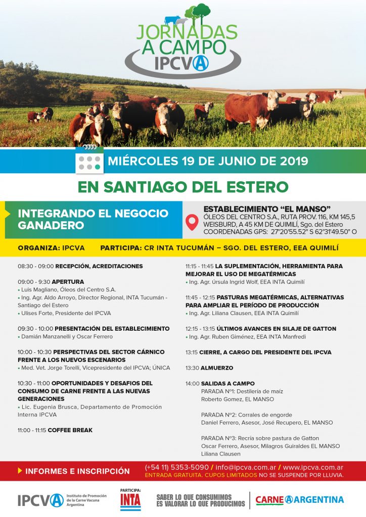 El próximo 19 de junio de 2019, el Instituto de promoción de la Carne Vacuna Argentina (IPCVA) llevará a cabo una nueva jornada a campo en el Establecimiento “El Manso” (Óleos del Centro S.A.) ubicado en la Ruta Prov. 116, km 145,5, Weisburd, a 45 km de Quimilí, Santiago del Estero.