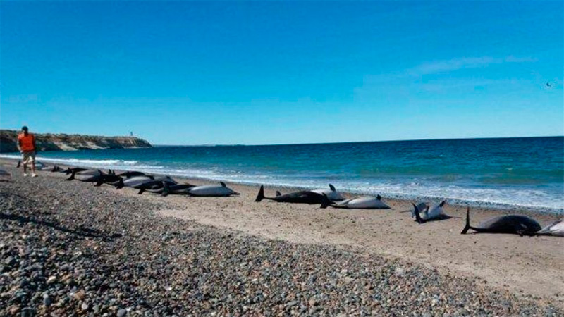 Los delfines quedaron varados en una zona costera conocida como “El Doradillo“, a orillas del Golfo Nuevo y sobre la cara sur de península Valdés,.