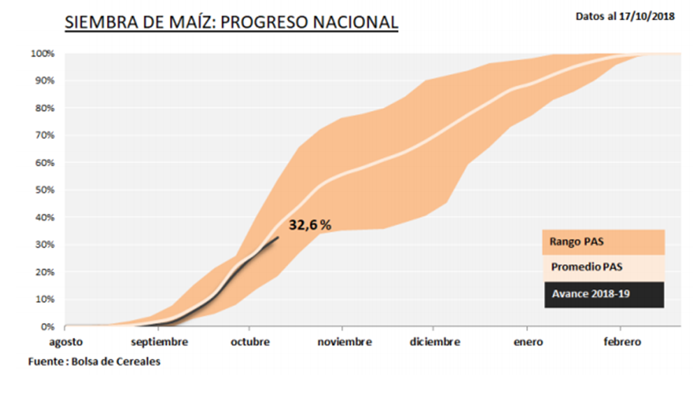 De acuerdo con los datos de la Bolsa de Cereales, el área cubierta de maíz alcanza el 32,6 % de las 5,8