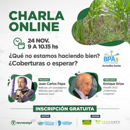 La empresa Tecnomyl S.A. brindará una charla “online”, gratuita, este miércoles 24 de noviembre, de 9 a 10:15 horas, sobre malezas y mercados.
