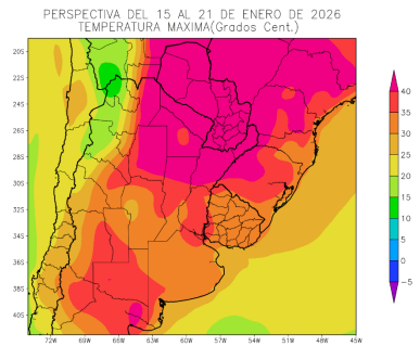 - El extremo este del NOA, el norte de Córdoba, el centro de Santa Fe, el sur de la Mesopotamia y el nordeste y el oeste de la Región Pampeana observarán temperaturas máximas superiores a 35°C, con un amplio foco hacia el norte con temperaturas máximas superiores a 40°C.