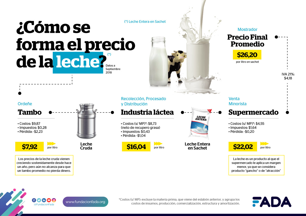 “Una vez más el sector lácteo arroja datos alarmantes: en la formación del precio del sachet de leche toda la cadena láctea presenta un resultado negativo. El tambo es el más perjudicado, ni siquiera alcanzó a cubrir sus costos operativos. El comercio presenta una pérdida de $0,20 por sachet de leche”, indicó FADA.