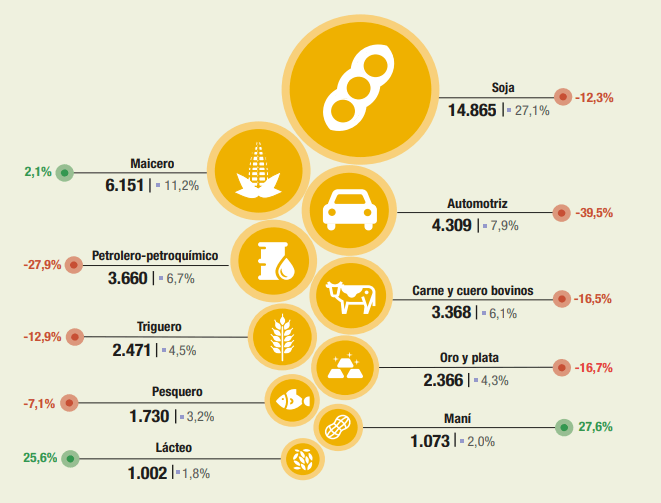 La lista del agro la completan el complejo triguero, con 2.471 millones de dólares, el pesquero con 1.730 millones de dólares, el maní con 1.073 millones de dólares, y el sector lácteo con 1.000 millones dólares y una variación positiva del 25,6% respecto a lo recaudado en 2019.