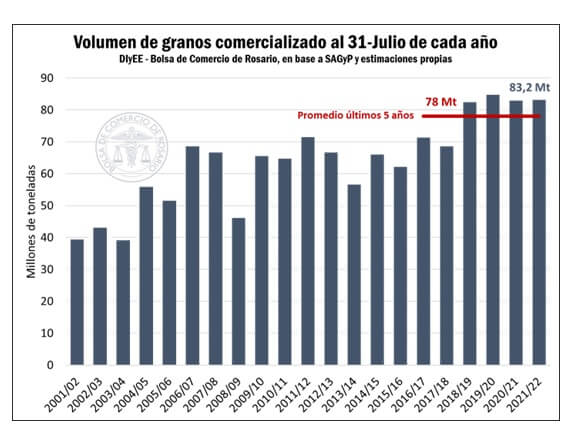 En julio, la venta de granos por parte de los productores llegó a 83,2 millones de toneladas, de acuerdo a la Bolsa de Comercio de Rosario (BCR). Se trata del segundo mayor registro histórico, cuando se comercializaron 84,7 millones para la misma altura de la campaña 2019/20.