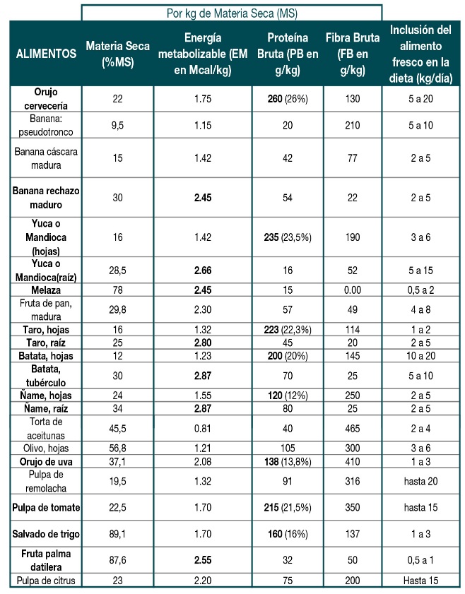 • Especies arbóreas (leñosas, arvenses o arbustivas y trepadoras): se destacan por los altos niveles proteicos y moderados a bajos contenidos en fibra. Entre ellos, se puede mencionar a la Mora (Morus alba), Leucaena (Leucaena leucocephala), Gliciridia (Gliricidia sepium), Pithecellobium dulce, Acacia farnesiana