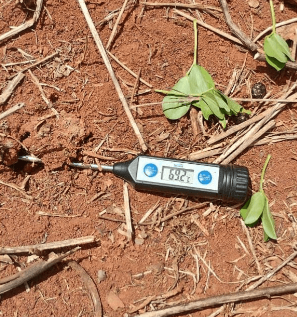 “Se realizaron mediciones en las horas de mayor incidencia de radiación, midiendo hasta 42°C en la temperatura del aire a pleno sol, y seguidamente se midieron las temperaturas de suelo en los dos manejos a diferentes profundidades: a nivel superficial del suelo, en el manejo tradicional se detectaron temperaturas de 58,9°C a 69,2 °C, y en el manejo con maní forrajero las temperaturas estuvieron entre 29,2°C y 30,4°C”, detalló el técnico del INYM.