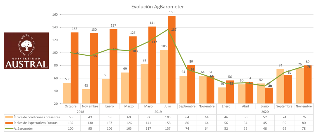 Según el análisis de la Universidad, “la confianza de los productores se está recuperando a partir del piso histórico del mes de junio 2020, y si bien aún muestra valores inferiores a 100 (que indica que las respuestas negativas superan a las positivas) parecería haberse iniciado un proceso de recuperación de la confianza“.