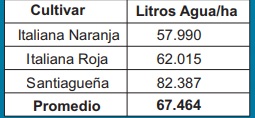 La producción de Agua en litros/hectárea/año estimativa, obtenida de la poda típica anual en los diferentes cultivares de tuna de la EEA Las Breñas, se observa en el siguiente cuadro: