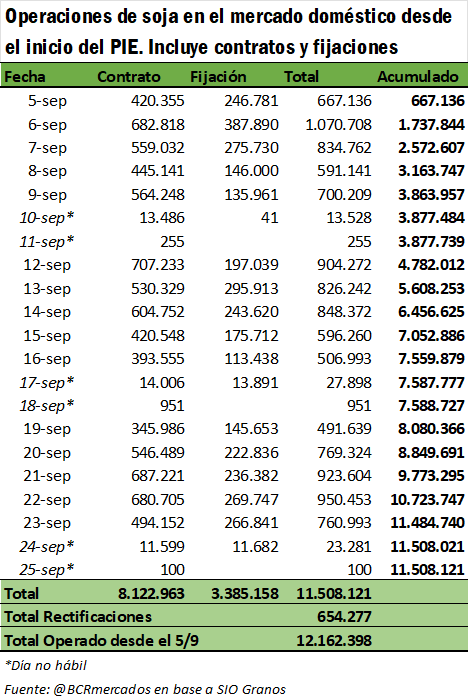 Según la Bolsa de Comercio de Rosario, en lo que lleva de vigencia el plan, se operaron en la plaza local 12,16 millones de toneladas de soja: 8,77 millones en contratos nuevos y 3,39 millones en fijaciones de precios.