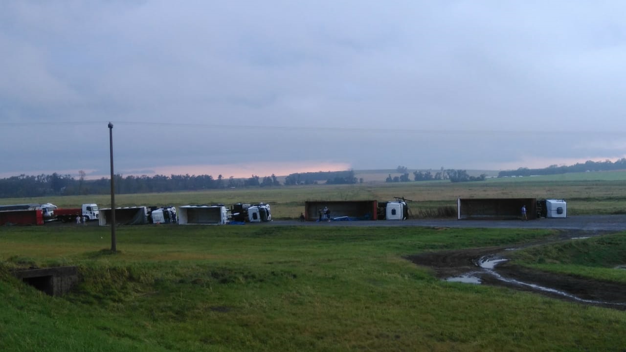 Cuatro camiones fueron volcados producto de los intensos vientos, mientras que a un quinto vehículo solo le “dio vuelta” el acoplado. Los lugareños registraron todo en imágenes y las compartieron a través de whatsapp, como en sus redes sociales.