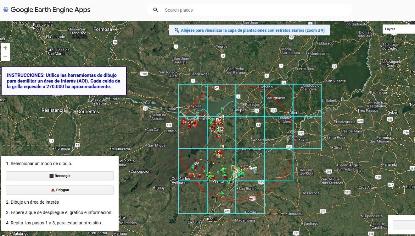 Diseñasa por la Dirección Nacional de Desarrollo Foresto Industrial, se trata de una Aplicación de Visualización Territorial que permite analizar, sobre una base cartográfica, la distribución espacial de la materia prima forestal (especie pino), mostrando la superficie existente por estrato etario dentro de un radio de búsqueda definido.
