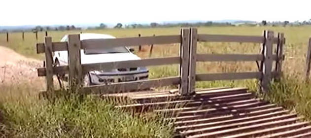 Para evitar el barro en las entradas a los campos, debajo de las tranqueras suele haber una tablas caladas que drenan el agua. En este caso, están, pero colocadas de una manera más eficiente ya que además permiten que la tranquera se abra sola.