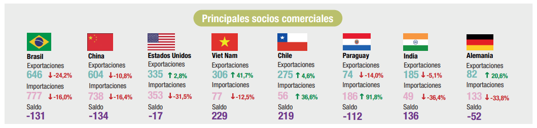 Los principales socios comerciales (sumando exportaciones e importaciones) fueron Brasil, China y Estados Unidos, acaparando el 32,1% de las ventas al exterior y abastecieron 53,3% de las compras externas.
