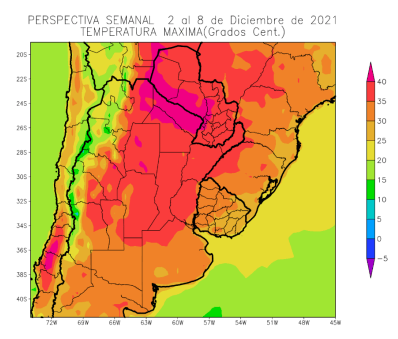 Para el caso del centro del NOA, la mayor parte de Cuyo, gran parte de la Región Pampeana y la mayor parte del Uruguay se observarán temperaturas máximas entre 30 y 35°C con focos con valores superiores.