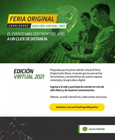 El reconocido fabricante de maquinaria agrícola, John Deere, lleva a un nuevo nivel su Feria Original, que este año se realizará de forma virtual y con libre acceso para todos los interesados. Será un espacio de encuentro para conectar a productores, contratistas, asesores agronómicos, cámaras, asociaciones y estudiantes con tecnologías que facilitan su actividad y los ayudan a producir de forma más eficiente y sustentable.