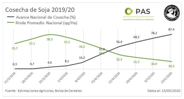 “Durante los últimos siete días se recolectaron poco más de 1,5 MHa en todo el país, elevando la superficie cosechada a 14,7 MHa, equivalente al 87,4% del área apta. El rinde promedio nacional descendió a 3030 kg/Ha y la producción acumulada se aproxima a 45 MTn. Solo restan recolectar 700 mHa de soja de primera y 1,4 MHa de soja de segunda para culminar el ciclo. Bajo este escenario, mantenemos la proyección de producción en 49,5 MTn“, informó la Bolsa de Cereales de Buenos Aires.