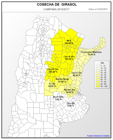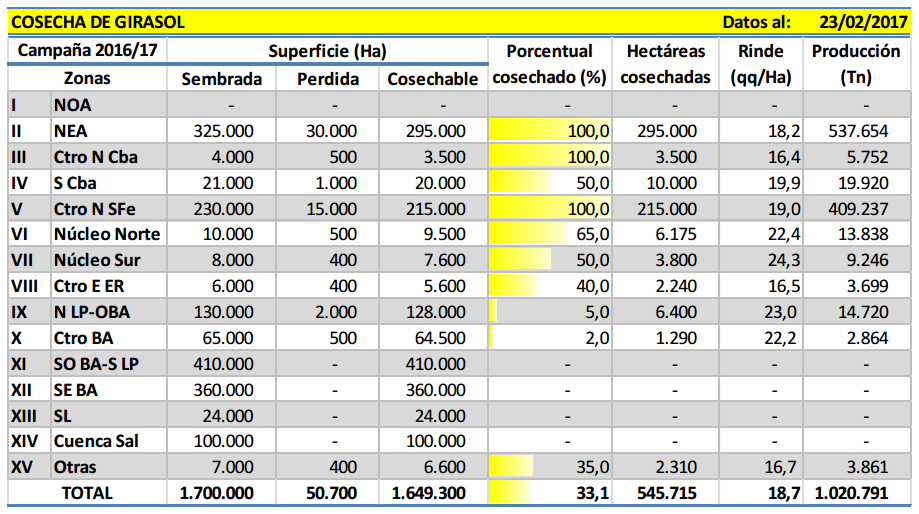 “Las labores de recolección de girasol continúan concentrándose sobre las regiones del centro del país, más precisamente en el Sur de Córdoba, Núcleo Norte y Sur, y Centro-Este de Entre Ríos, regiones que en conjunto aportan apenas el 3 % de la superficie implantada a nivel nacional. En paralelo, se registraron las primeras labores de cosecha de lotes tempranos en el centro y oeste de Buenos Aires, donde se espera que la recolección cobre mayor fluidez en las próximas semanas. De esta manera, luego de registrar un avance intersemanal de 1 punto porcentual, el progreso nacional de cosecha alcanzó el 33,1 % de la superficie apta, elevando el rinde medio a 18,7 qq/Ha. En números absolutos se cosecharon más de 545 mHas, acumulando un volumen parcial superior al millón de toneladas”, informó la Bolsa de Cereales de Buenos Aires.