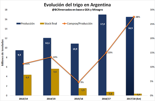 Y finalizó: “La quita de ROEs y retenciones derivó a que el trigo argentino vuelva al mundo y que hoy las compras 2017/18 se adelanten hasta marcar un record de los últimos 5 años. Si bien la producción nacional sería menor que la campaña pasada por inclemencias climáticas, aún se encuentra en un nivel de productividad alto si lo comparamos con los años anteriores. La buena intención de siembra, la mayor tecnología aplicada para la producción y la comercialización podrían derivar en otro éxito triguero 2017/18”.